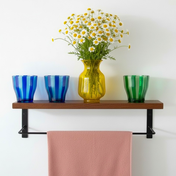 Estante de madera laqueada y hierro con dos usos, puede ser un estante con contención y si lo invertís es un estante con barral.