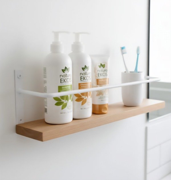 Estante de madera laqueada y hierro con dos usos, puede ser un estante con contención y si lo invertís es un estante con barral.
